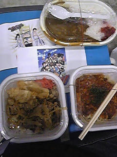 シェイクスピア全く判んないんですけど(成歩堂に詳しく訊きたい。悲劇とか興味無いですし) 観客参加型です。 只今、休憩中。 七帆さん腰細っ!足細っ!ヘソっ!ジュリエット役可愛いですぅ(≧△≦) ジュリエットはヘソ出してません。今日来るまで七帆さんが何の役か知らなかったです。(←バカ) ロミオ(人形)とジュリエットの声分け素晴らしいです。 ハムレット役の玉野さんへの元ジェンヌさんからのお花 文の途中で休憩終了になりました(^^A; いえ、お花が多いなぁと思ったら、ヅカの先生やってたようで……。 あぁ、そういう繋がりですか☆七帆さん教え子。 マッスルミュージカルが前から観てみたいとは思っていた……。 しかし!それが此処で(小規模ですが)見れるなんて! それに七帆さんの可愛い姿が見れて、歌聞けて、腹から笑えて、8000円なんて、なんて安いの!と思ってしまいました。 こんなんだったら、誰か誘えば良かった……。でもチケ代がチケ代だし、日付が日付だし、誘い辛いかったんですよ~。 劇場で、29日に一体どれだけの人が同じ空気を吸う事になるんだろう?とか、思いました……。 「今日で何回目」「えーっと●日と●日と観て~」とか言う会話聞いて、金持ちだなぁ~と思った。 この一回が日付的とヲタ予算的にギリギリ。 下右から:REBORN! ボンゴレファミリー秘伝ツナ入りミートソーススパゲッティ。同じく イーピンとランボの餃子牛丼セット。 上:べるぜバブ 石矢魔高校購買部ヤンキーカレー。 見事に主食オンリーですねぇ☆……甘い物食べたかったけど、無理!銀魂行くの無理( ̄▽ ̄;)昨日から人気です☆ 朝食に、乗り換え途中で吉野家のハムエッグ納豆定食食べたのにねー☆(出掛ける前に納豆食すって、女としてどーなのさ?) はいっ☆今日も幕張メッセにいます☆(^O^)/ あっ、昨夜の仕事の休憩は寝てました。ご飯食べてません。 今日はねー、昨日より更に杉山さん見れないんですよ~。でも、来てます。どーせ東京行くんだし、どーせなら行っとこうぜ!って感じですよ~。 今日は竹ぽん(竹本英史さん)観てから、スクリーンで宝塚観て来ますねぇ☆